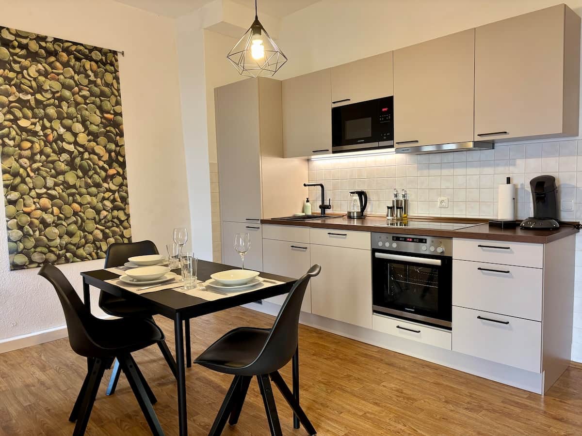 Kitchen, Coffee machine, Dishwasher, Kitchen stove, Microwave, Oven, Refrigerator, Toaster, Baking sheet, Cooking basics, Dining table, Dishes and silverware, Freezer, Hot water kettle, Wine glasses
